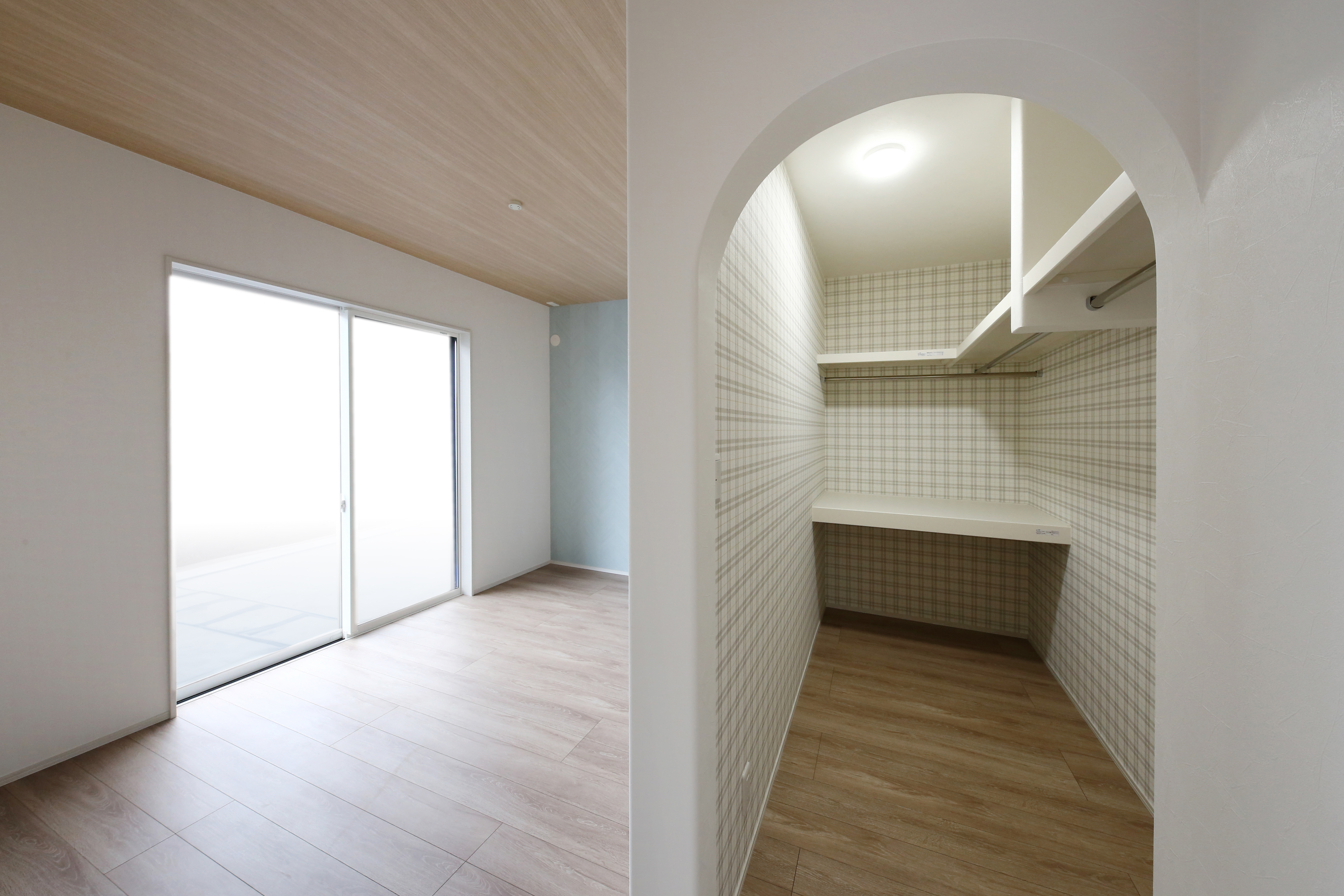 居室内にWICがあり移動の手間を省きます。住まいの至る所でアーチ下がり壁を採用しているので空間を完全に区切らず開放感を確保し、さらに空間の柔らかさを醸し出しています。