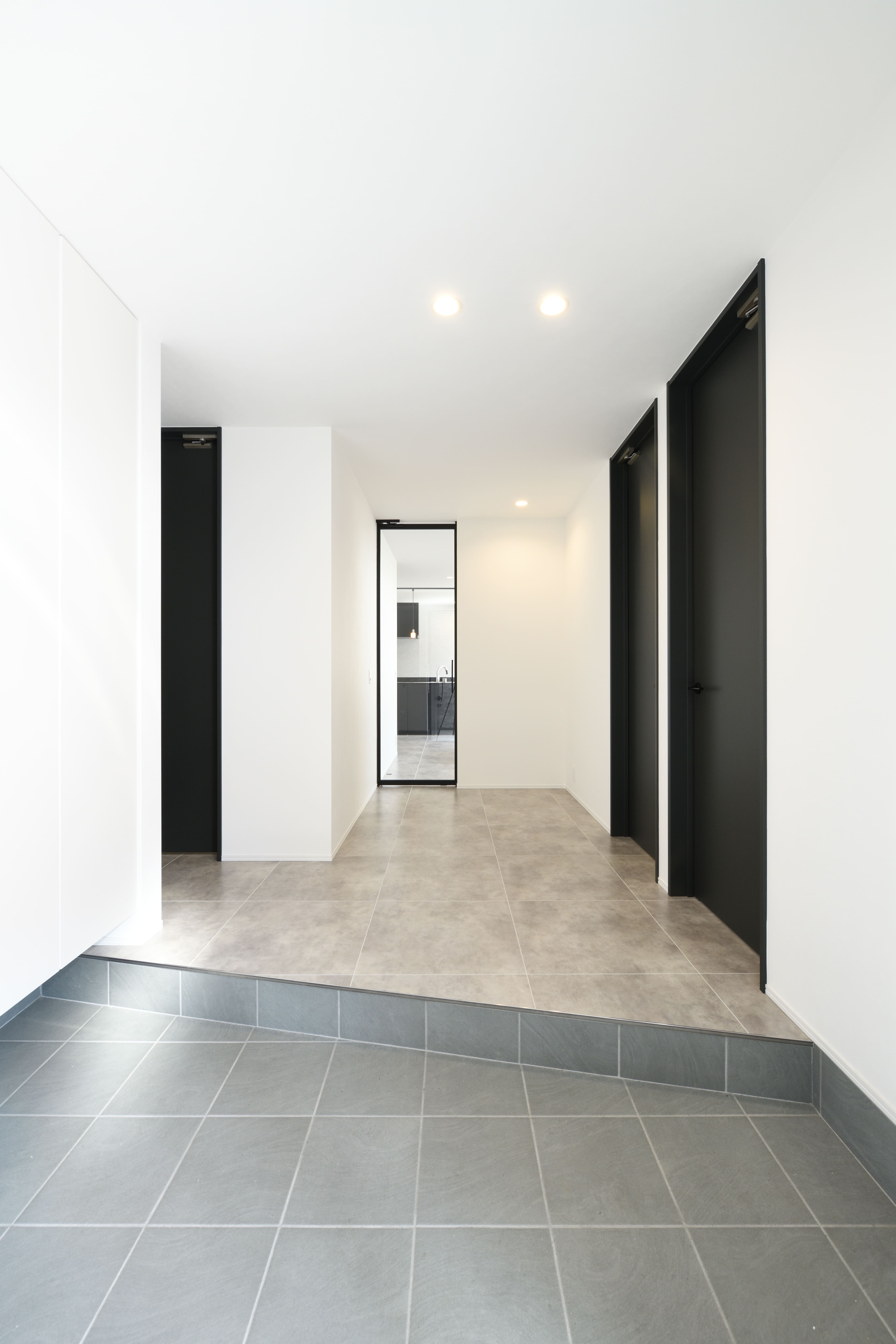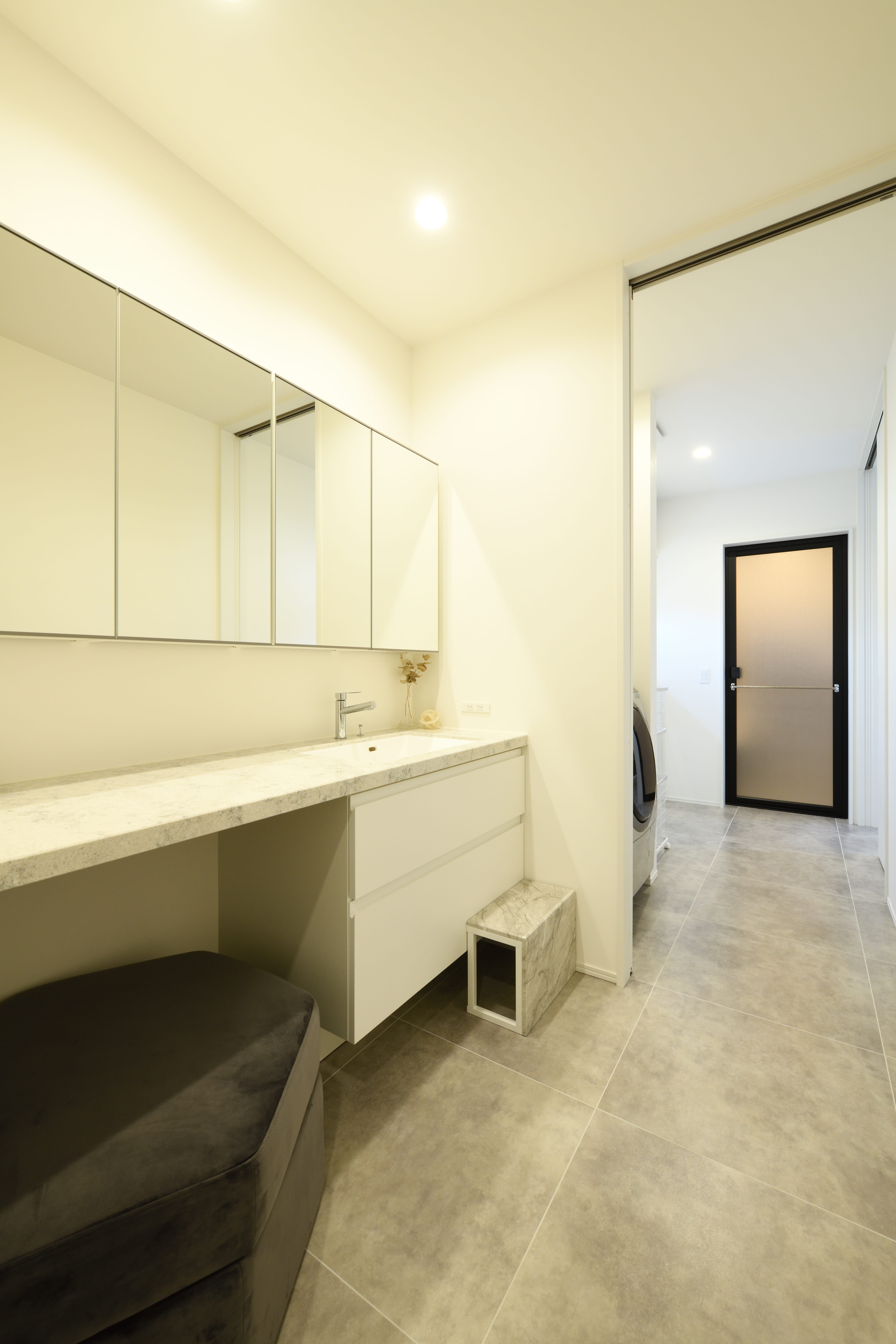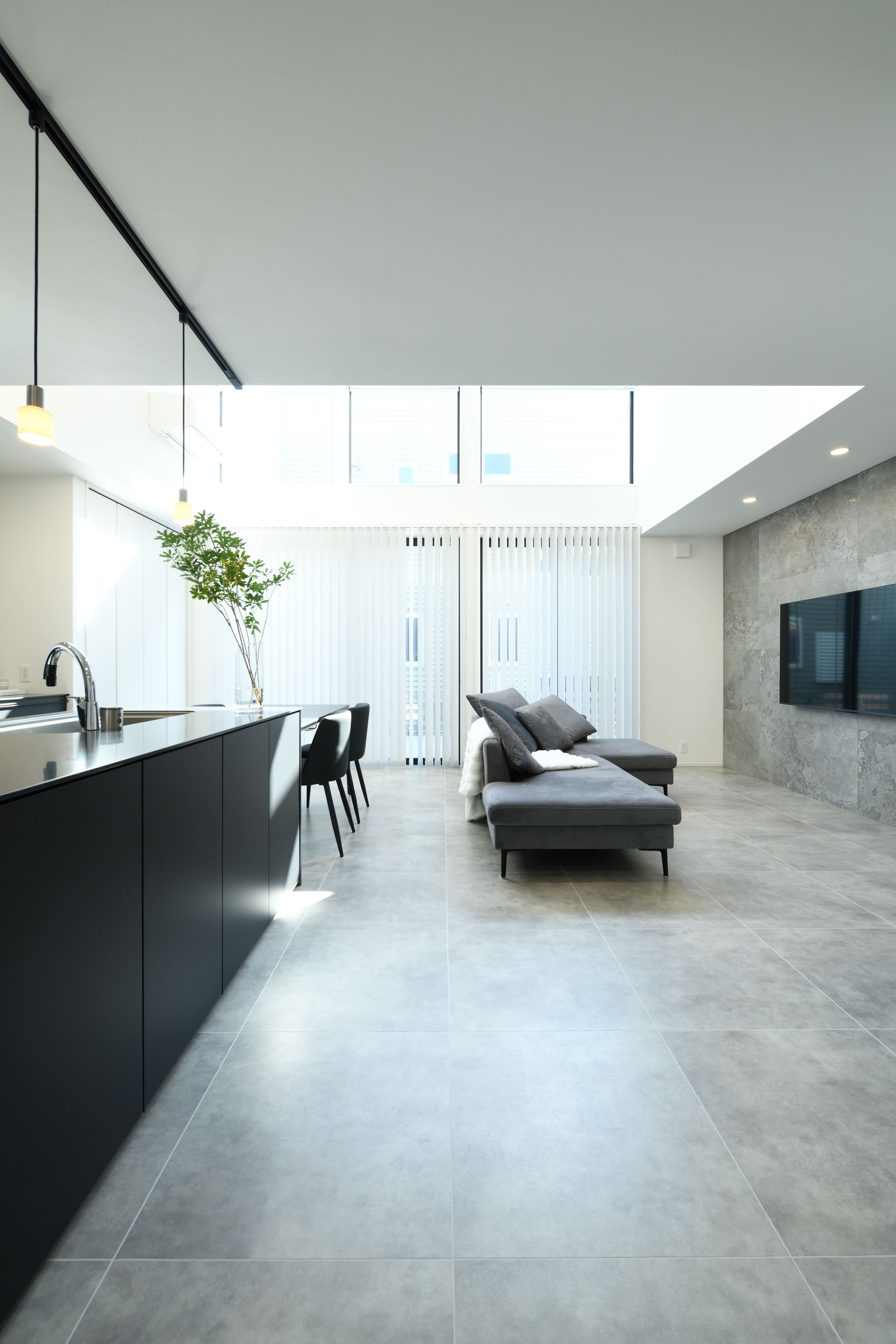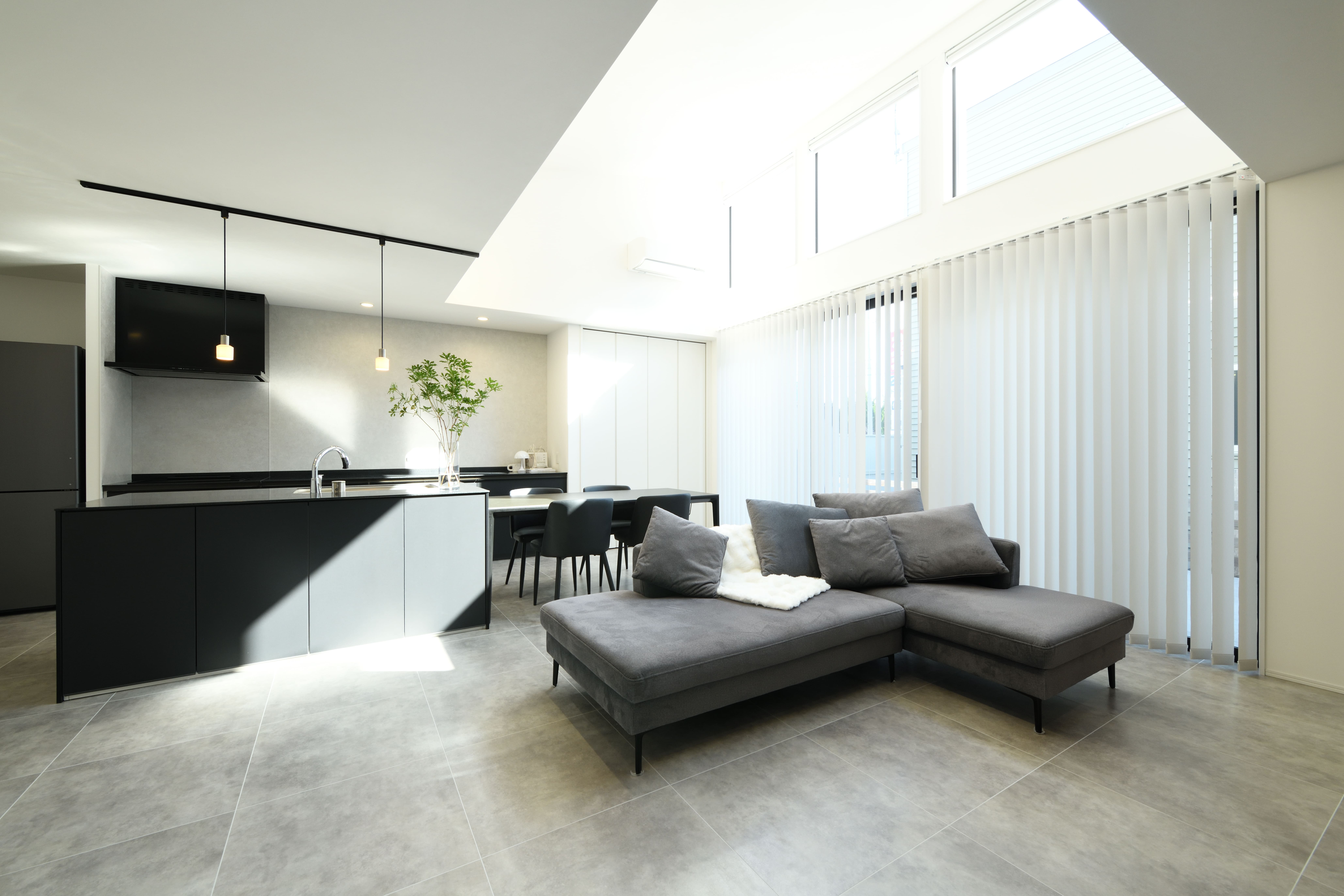 シンプルの中にスタイリッシュさを感じる外観。玄関を開けると、黒のハイドアとグレーのフロアタイルで高級感を演出。ガラスドアの向こう側に見えるおしゃれなキッチンはとてもハイセンスです。ドアをすべてハイドアにしてあるため、平屋で限られた空間でも狭さを一切感じません。リビングは勾配天井と大きな窓で常に明るく、上から差し込む陽もおしゃれを演出してくれます。玄関とリビングをつなぐファミリークローゼット、キッチンと横並びになったランドリールームなどママには嬉しい家事ラク動線も取り入れられ、常にキレイな状態を保てる工夫が施されています。