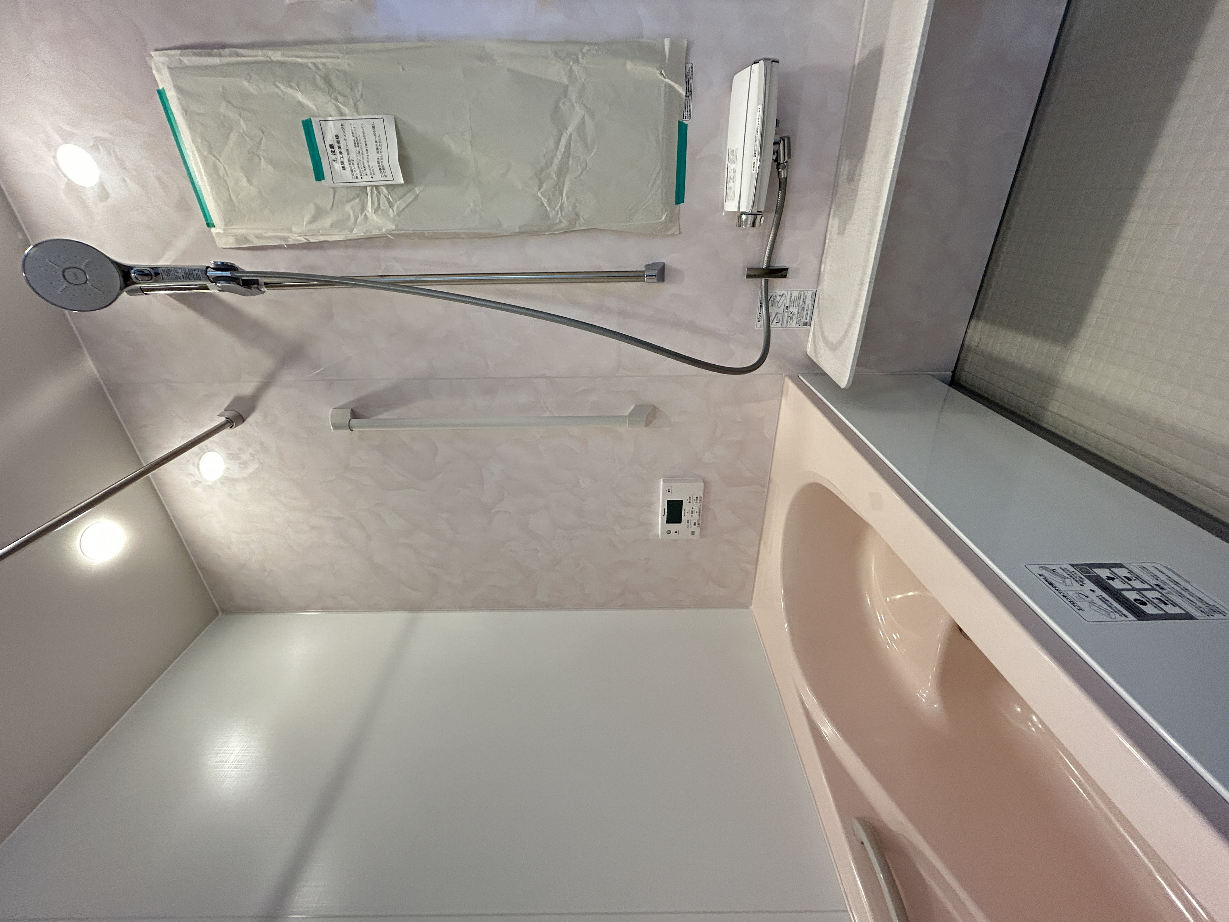 浴槽とアクセントパネルのピンクが 空間の差し色になっています