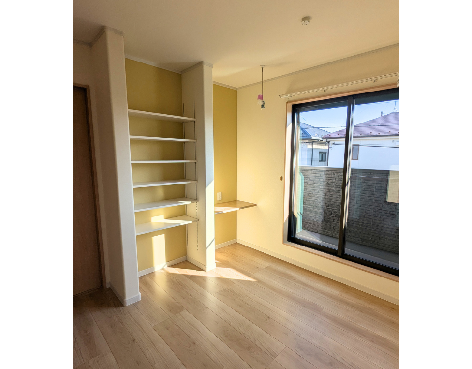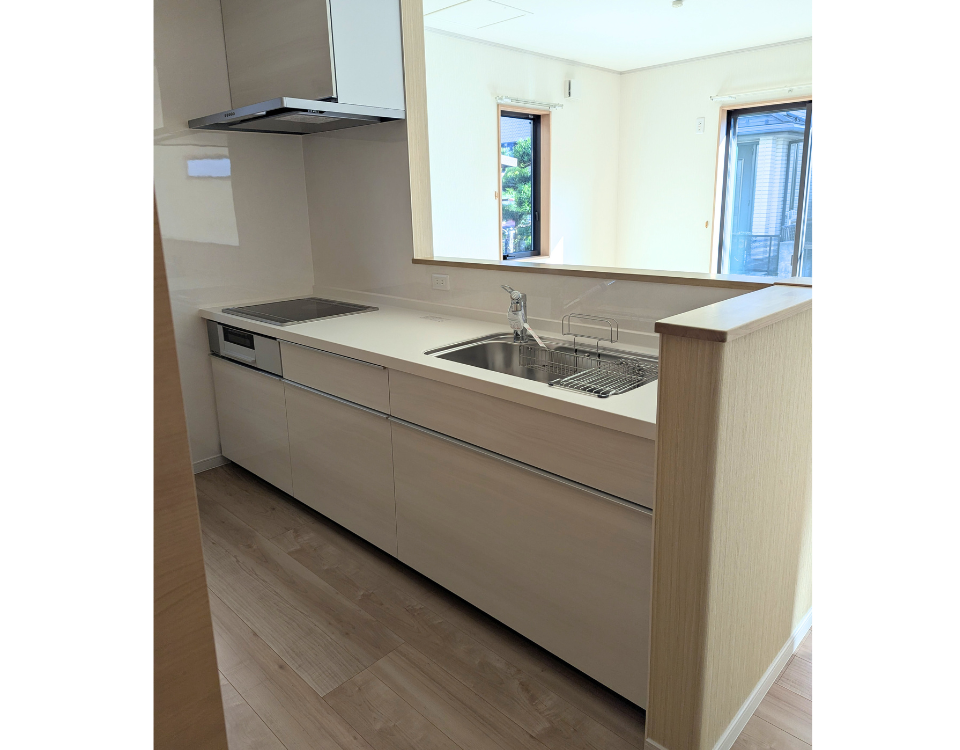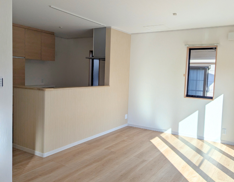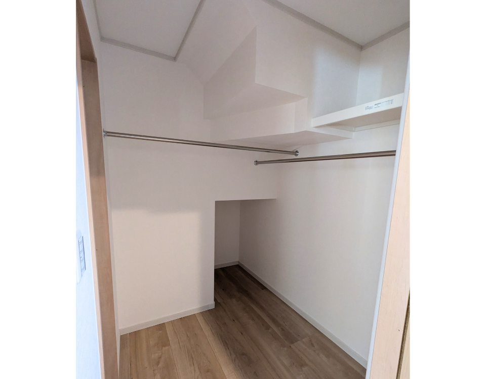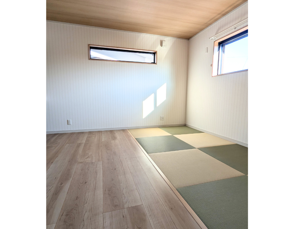 約32坪 3LDK+ファミリークローゼット ■1階には、約15帖のLDK、ファミクロ、和室。 リビングと繋がらない独立した和室は、静かで落ち着いた空間になるので来客や寝室にピッタリ。階段下を利用したファミリークローゼット、洗面所の室内物干しもあるので、1階で生活を完結することも可能。 ■2階ホールは、掃き出し窓のある明るい空間。天気を気にせずお洗濯ができる室内物干しスペース。ちょっとした作業に便利なカウンターを設置。洗濯ばさみなどの物干しグッズ置きにもちょうどいいオープンタイプの収納も。 ■居室に設けた大容量のウォークインクローゼットは、廊下側からも出入りができる家族みんなの共有収納。 ■太陽光+蓄電池搭載