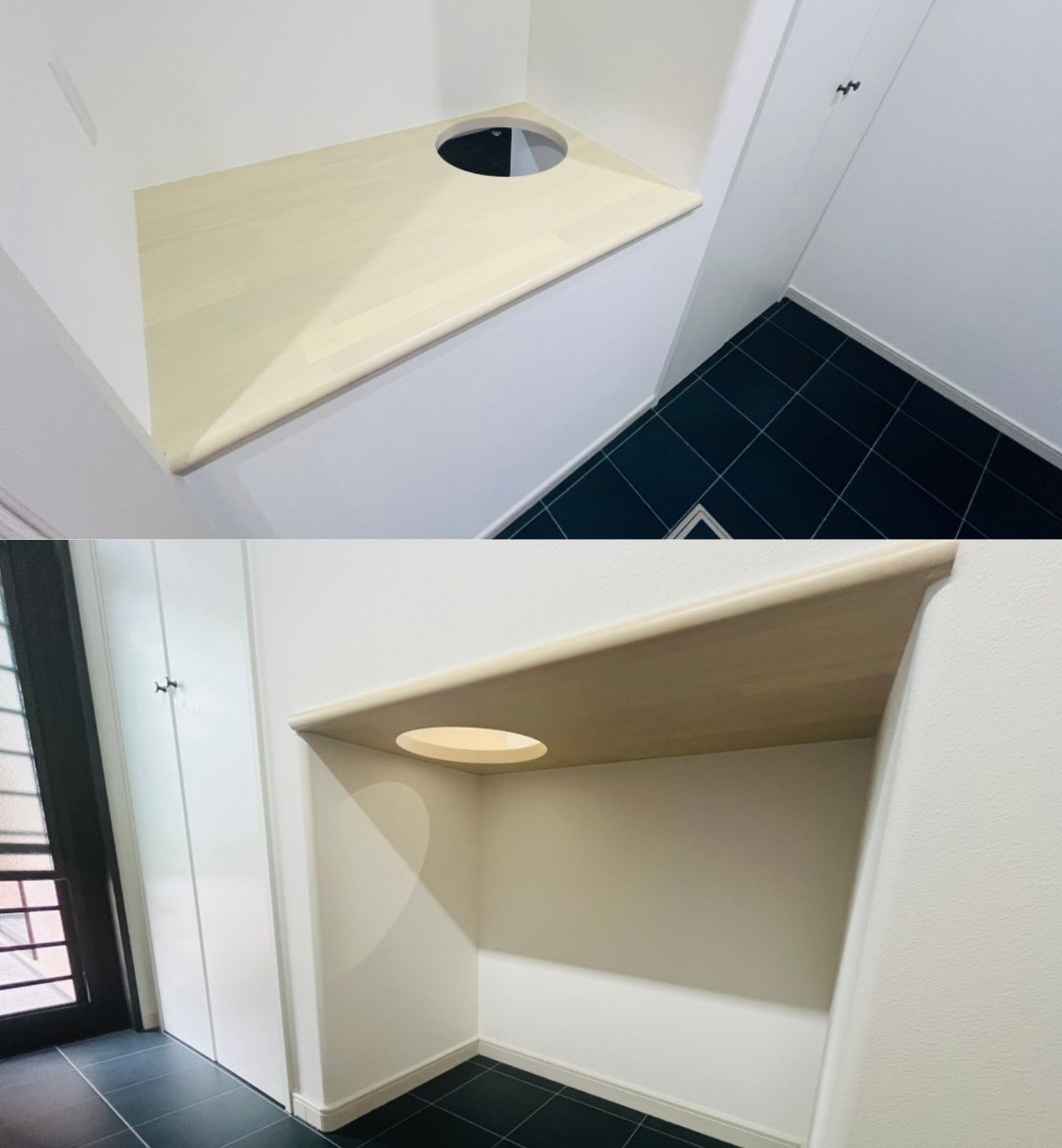 脱衣所とランドリールームをつなぐ工夫を施しました。 脱衣所で脱いだ衣類をカウンターの開口部から落とすと、そのままランドリールームへ届く仕組みになっています。洗濯物を持ち運ぶ手間がなくなり、効率的に家事が進むスマートな設計です。見た目もスッキリとしたデザインで、使い勝手と美しさを両立した空間に仕上がりました。