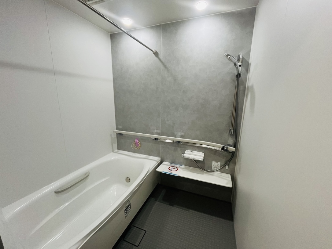 落ち着いたグレーのアクセントパネルが印象的な、モダンで洗練されたバスルーム。 ゆったりとした浴槽で、1日の疲れを癒すリラックスタイムを。