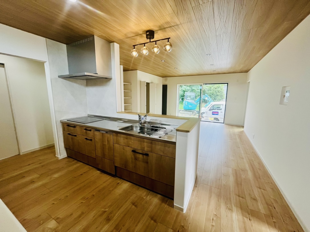 木目を基調とした温かみのある空間デザインが特徴のLDKです。 天井・床に統一感のある木目材を使用し、心地よい一体感を演出。 リビングへとつながる大きな窓からは自然光が差し込み、明るく開放的な空間に仕上がりました。シンプルながらも素材感と機能性を兼ね備え、永く快適に過ごせるように。