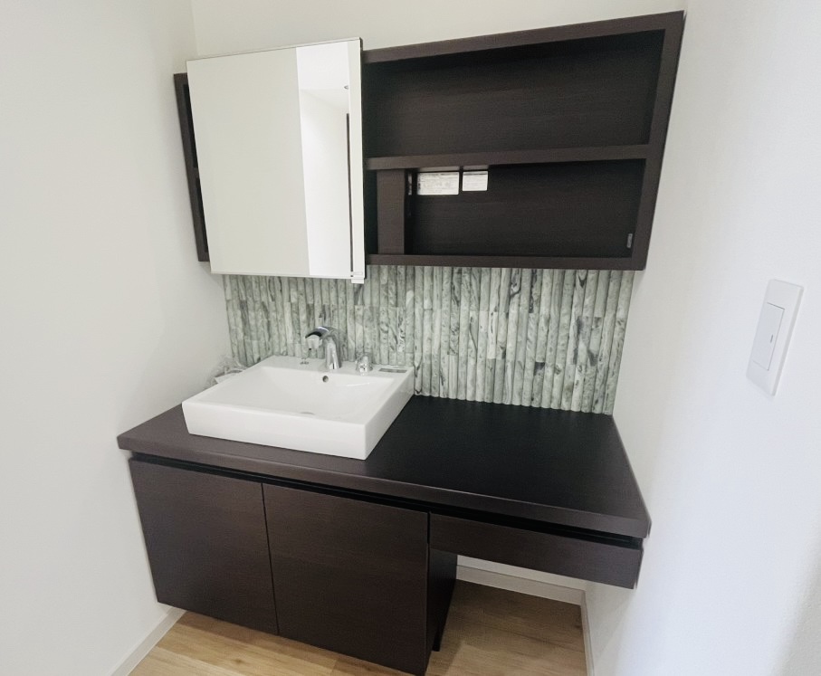 ダークブラウンのカウンターと収納が高級感を演出する洗面化粧台。 施主様こだわりのデザインタイルを採用し、空間に個性と上質なアクセントを加えました。機能性とデザイン性を両立した、毎日の身支度が楽しくなる洗面スペースに。