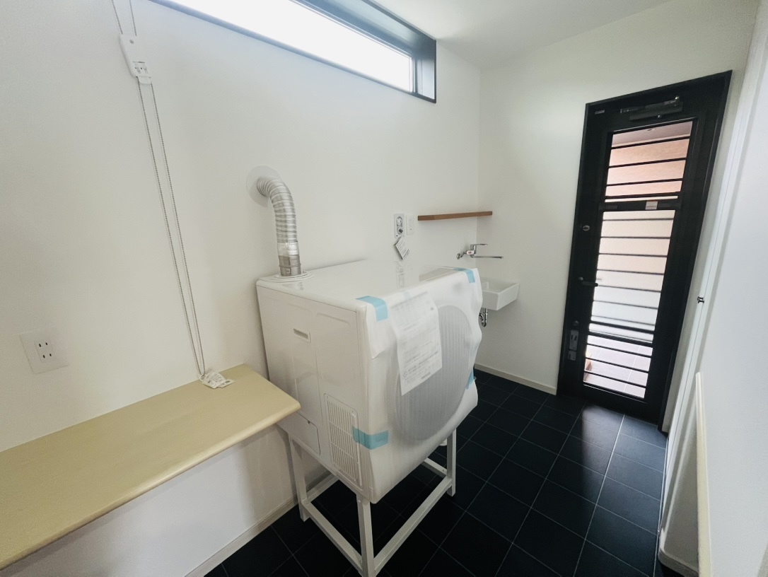 家事のしやすさを考え抜いた、機能的なランドリールーム。 ガス乾燥機「乾太くん」を設置し、天候に左右されない洗濯環境を実現しました。 カウンターは洗濯物をたたむスペースとしても活躍。勝手口から外へすぐに出られる動線も確保し、家事時間を短縮できる使い勝手の良い空間に仕上がっています。