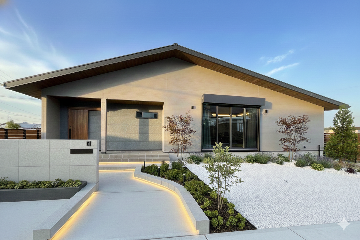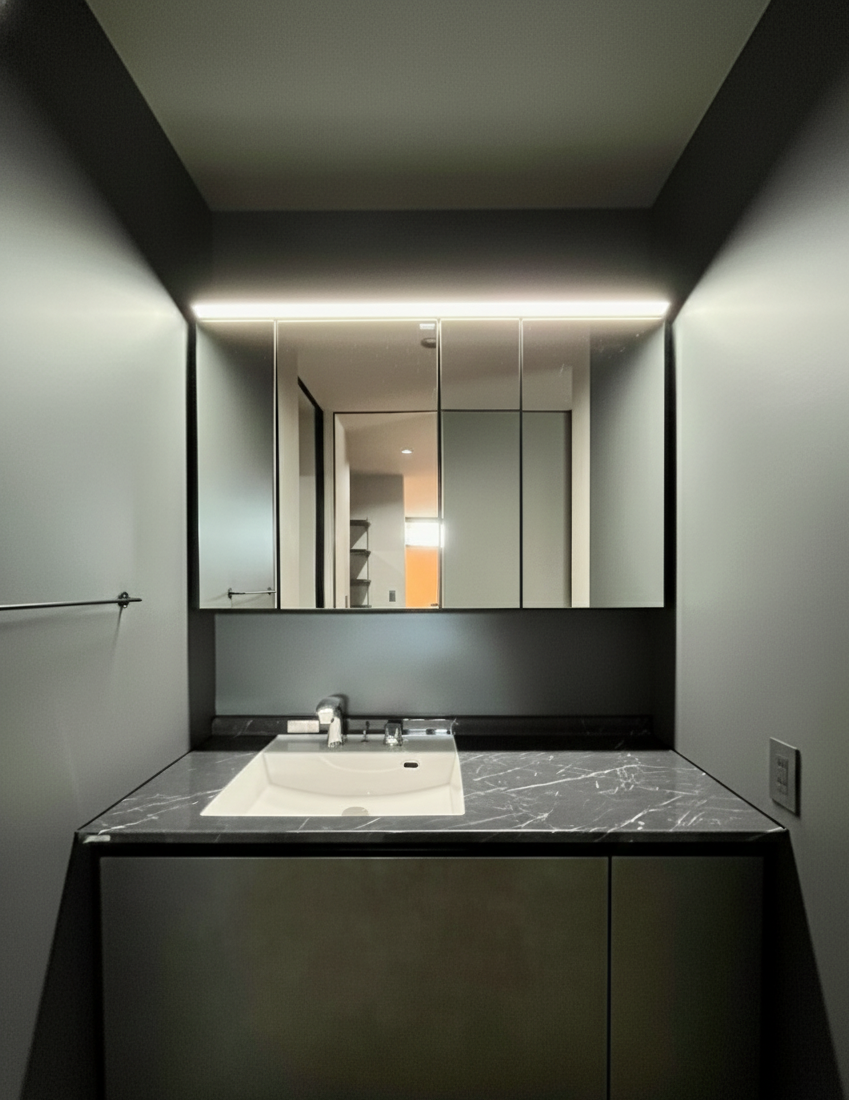 ダークトーンの石目調カウンターと、直線的で無駄のない造作洗面台が、空間全体に落ち着きと重厚感をもたらしています。ミラー背面には間接照明を仕込み、柔らかな光が壁面を照らすことで、奥行きと高級感を演出。