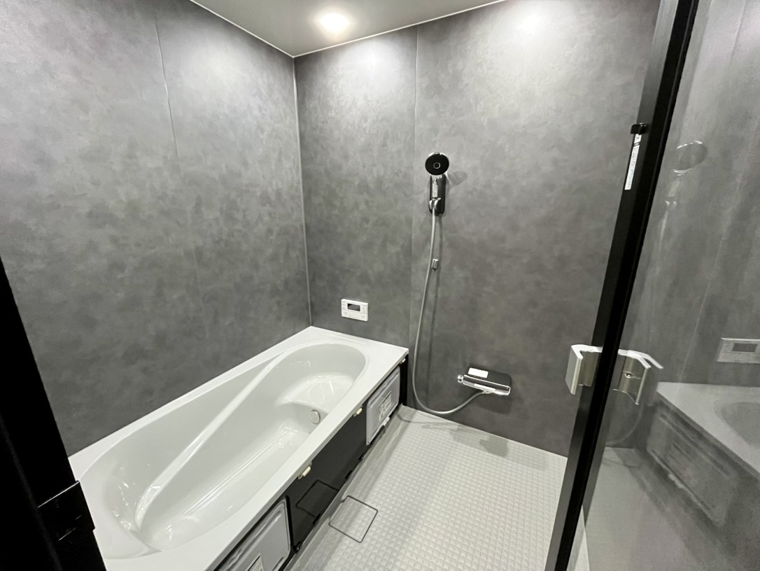 グレー基調でまとめた、落ち着きのある浴室。壁面は石目調パネルを採用し、シンプルながら上質な印象に仕上げました。ガラス扉で圧迫感を抑え、空間をすっきりと演出。