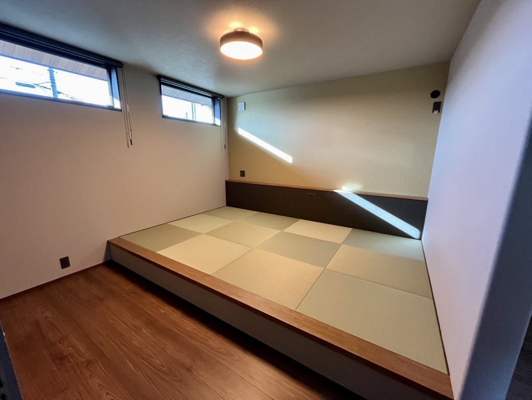 寝室は小上がり畳スペースを採用。ベッドを置かず布団を敷き、畳ならではのやわらかな肌触りと落ち着きのある空間で、心身ともにリラックスできます。高窓から差し込む自然光が時間帯によって表情を変え、シンプルながらも豊かな空間に仕上がりました。和の要素を現代的に取り入れ、暮らし方に寄り添った、静かで快適な寝室空間となりました。