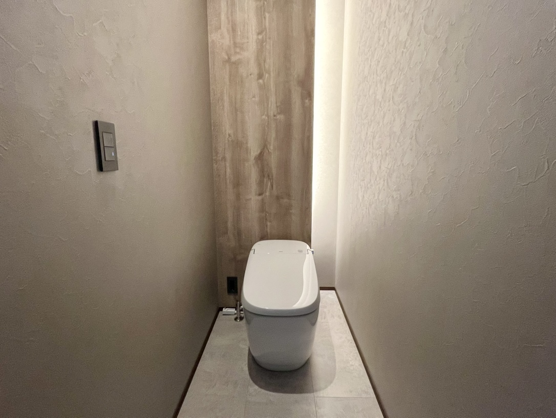 背面に間接照明を仕込み、やわらかな光が壁面を照らすことで、奥行きと上質感をもたらしています。直接照明を抑えることで、落ち着きのあるホテルライクな雰囲気を演出しました。