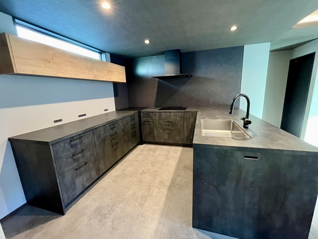 GRAFTECTのハーフオープンキッチンを採用。ダークカラーでまとめ、空間全体をシックな印象に。手元はさりげなく隠しつつ、LDKとのつながりはしっかり確保。デザインと使いやすさをバランスよく取り入れたキッチンです。