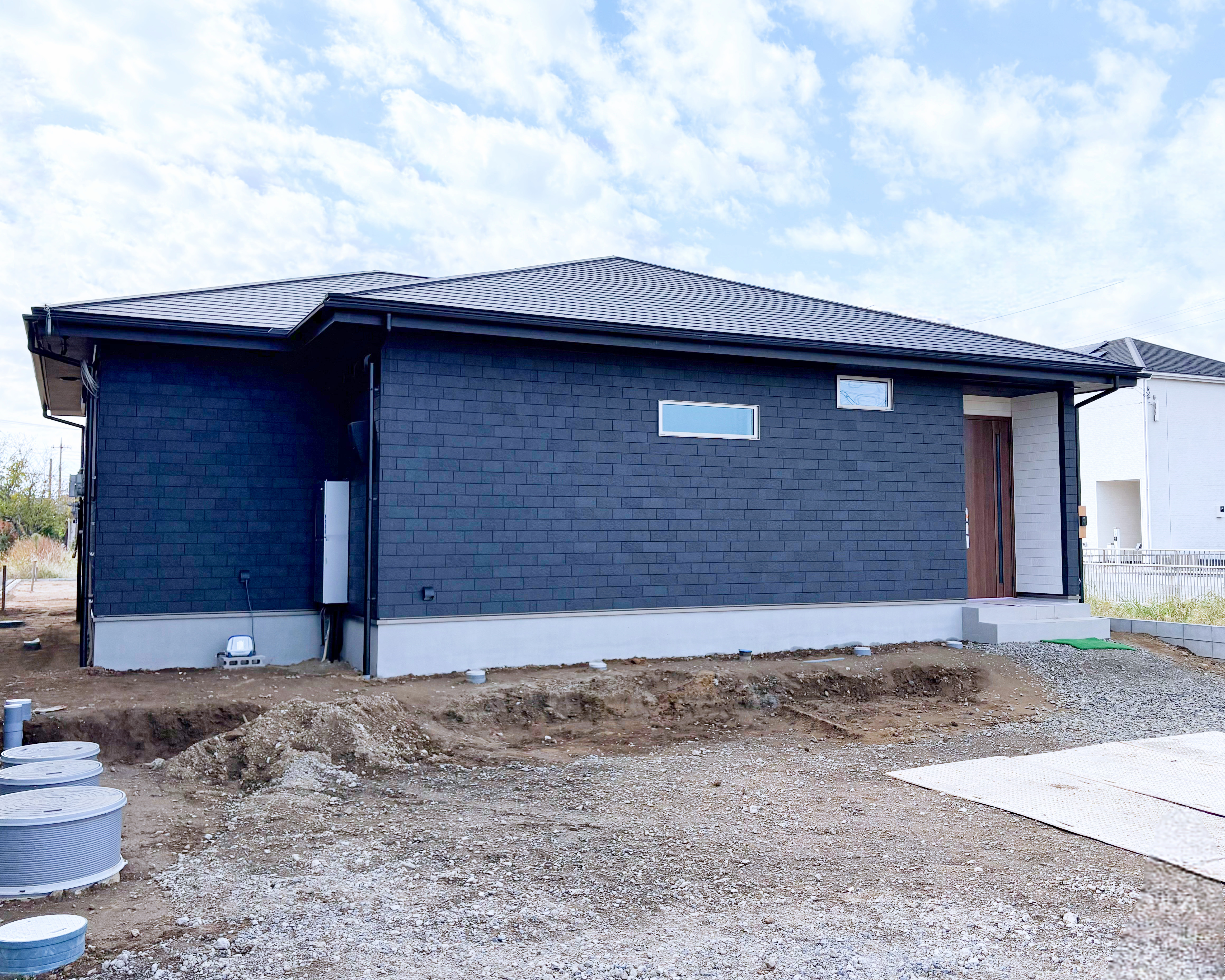 ネイビーのレンガ調の外壁がスタイリッシュな平屋。玄関ポーチには同シリーズのホワイトを使って明るさも備えたメリハリのある表情に。